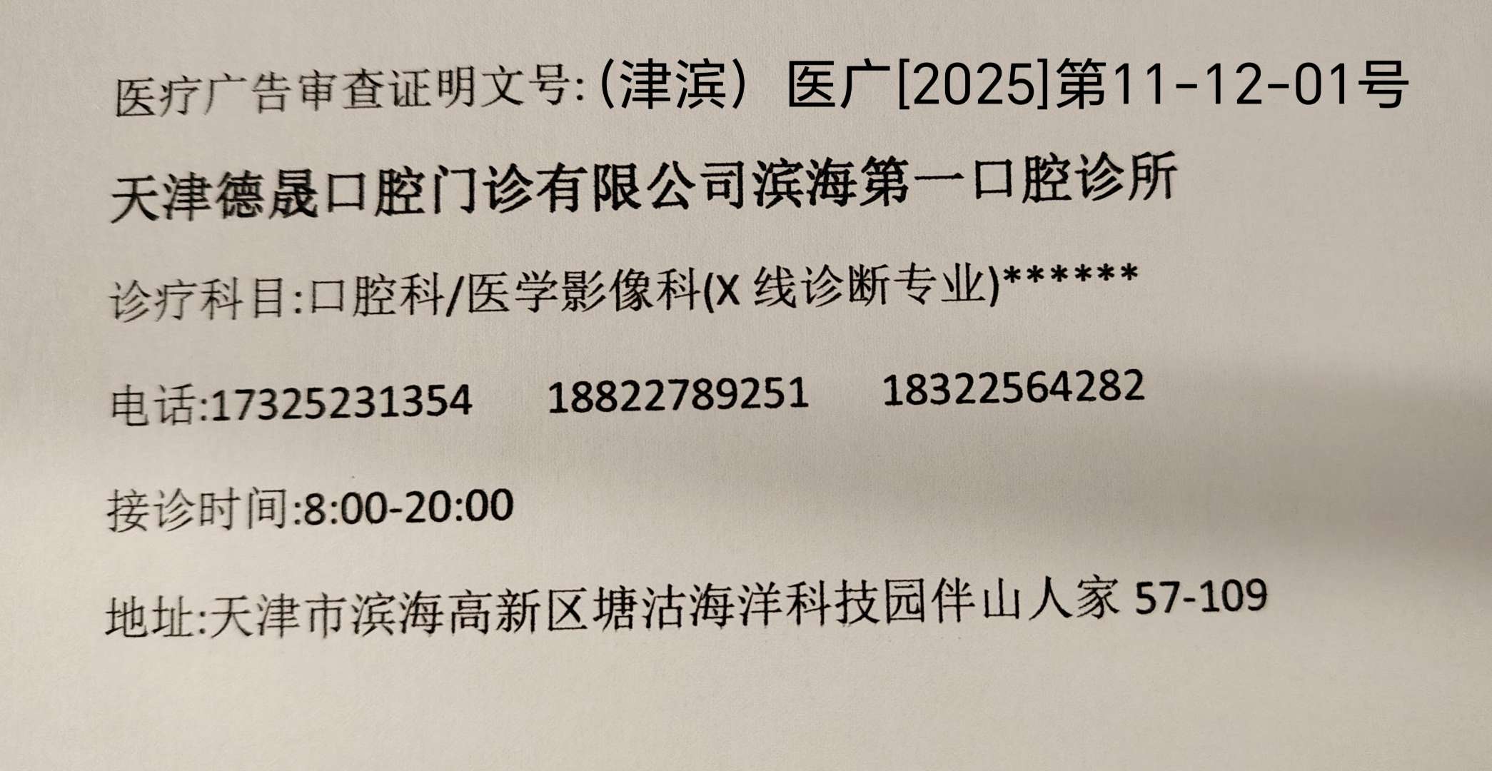 滨海新区行政审批局医疗广告审查许可公示(天津德晟口腔门诊有限公司滨海第一口腔诊所)